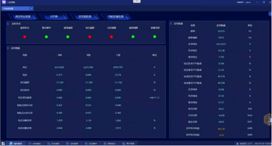3)电能质量监视:在电能质量监控图中,可以直接查看电流电压总有效值、电压波动、电压总畸变、正反向有功电能、有功、无功功率等电能质量信息。可以根据这些信息监测现场电能的质量,及时的做出应对方案。