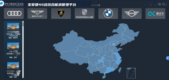 该汽车投资有限公司于2012年在杭州成立,负责中国区经销商网络的部署和业务的运营管理。门店分布于江苏、上海、浙江、北京、广东等省。在国内共有45家汽车经销商,主要集中销售奥迪、宾利、兰博基尼、保时捷和 BMW/MINI 等豪华品牌。能耗管理系统主要针对办公区、会客区、维修区、光伏发电等功能区域进行能源计量和管理。目前45家门店均已完成搭建部署及交付。