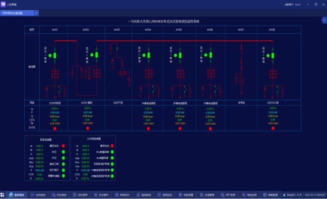 (1)运行监视图,包括显示设备运行状态、各主要电气量(电流、电压、频率、有功、无功)、环境数据(气温、湿度、气压、风速、风向、日照强度等)等的实时值;
